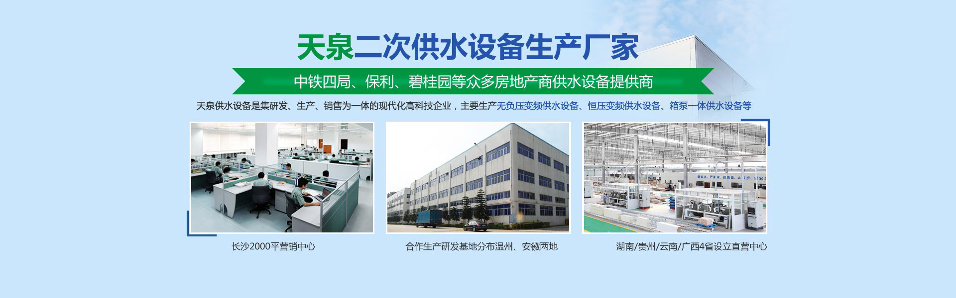 長沙天泉供水設備有限公司位于長沙雨花經濟開發(fā)區。公司是集研發(fā)、生產、銷售為一體的現代化科技型企業(yè)公司生產銷售的產品有無負壓變頻供水設備、自來水加壓泵站、變頻調速恒壓供水設備、智慧標準泵房、智慧水務、一體化預制泵站、循環(huán)水系統工程等二十幾大類別。